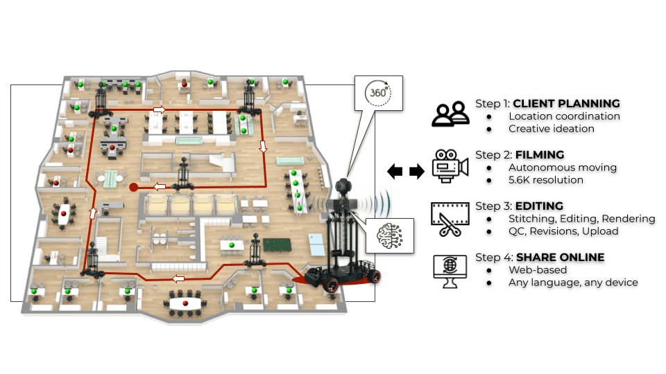 Our robot technology is built with a customized lens solution and depth sensors, making the process of capturing your campus completely independent.